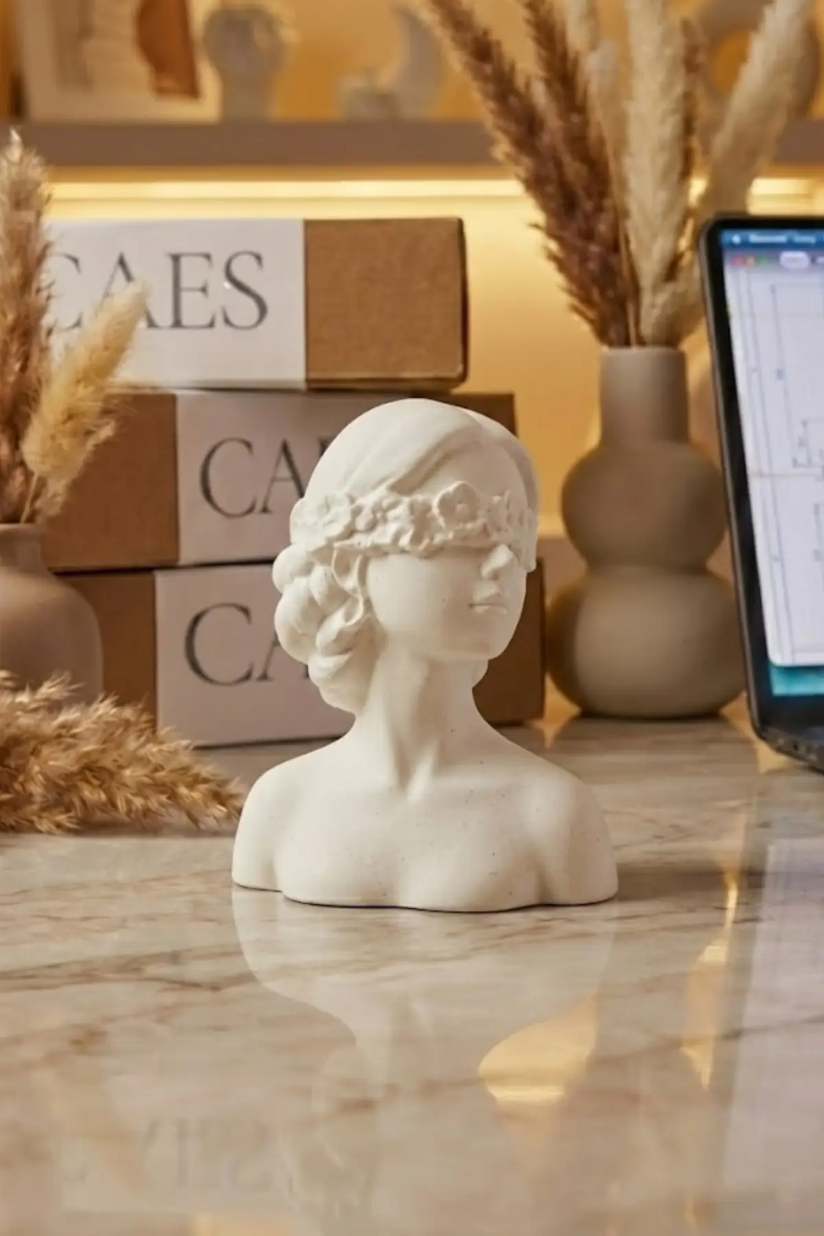 Büstün romantik ve gizemli havası, vazonun modern ve mimari hatlarıyla dengeleniyor. İster yatak başucunuzda, ister salonunuzun en özel köşesinde; bu set size, üzerinde düşünülmüş, profesyonel bir dekorasyon dokunuşu sunuyor. Size sadece vazonuzu kuru çiçeklerle veya pampas otlarıyla taçlandırmak kalıyor.